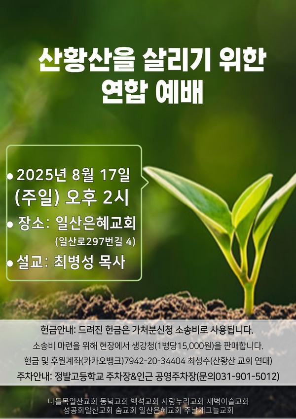 연합 예배는 산황산 숲을 지키고자 하는 시민 누구나 참여할 수 있고, 예배가 열리는 일산은혜교회는 일산로 297번길 4에 자리하고 있다. 당일 주차는 정발고등학교 주차장, 또는 인근 공영주차장을 이용하면 된다. 문의 031-901-5012