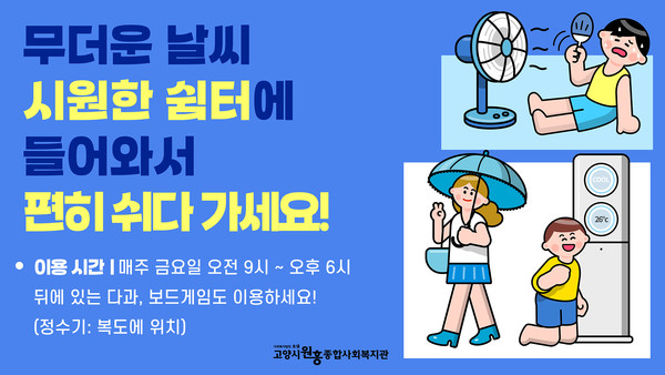 한편, 원흥종합사회복지관은 본격적인 무더위에 대비해 7월부터 기관을 상시 개방하고 있다. 별도의 신청 없이 복지관 운영 시간(오전 9시부터 오후 6시까지) 내에 지역주민 누구나 자유롭게 이용할 수 있으며, 에어컨이 가동되는 쾌적한 공간에서 폭염 위기를 피할 수 있다. 특히 매주 금요일에는 2층 프로그램실을 무더위 쉼터로 지정해 지역주민들이 시원한 공간에 마련한 다과와 보드게임을 즐기며 건강하고 즐겁게 여름을 날 수 있도록 지원하고 있다.