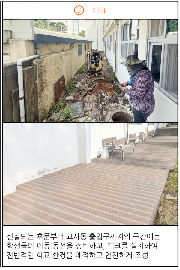고양교육지원청은 8월 말까지 일산초교의 기존 폐쇄된 후문을 철거한 뒤 문의 주 석재 마감 작업 후 새로운 교문으로 교체 설치하고 교내 통행로를 재정비하기 위해 후문 좌측부지에는 보도블록 포장을, 우측부지에는 데크와 디자인 펜스도 설치할 예정이다.