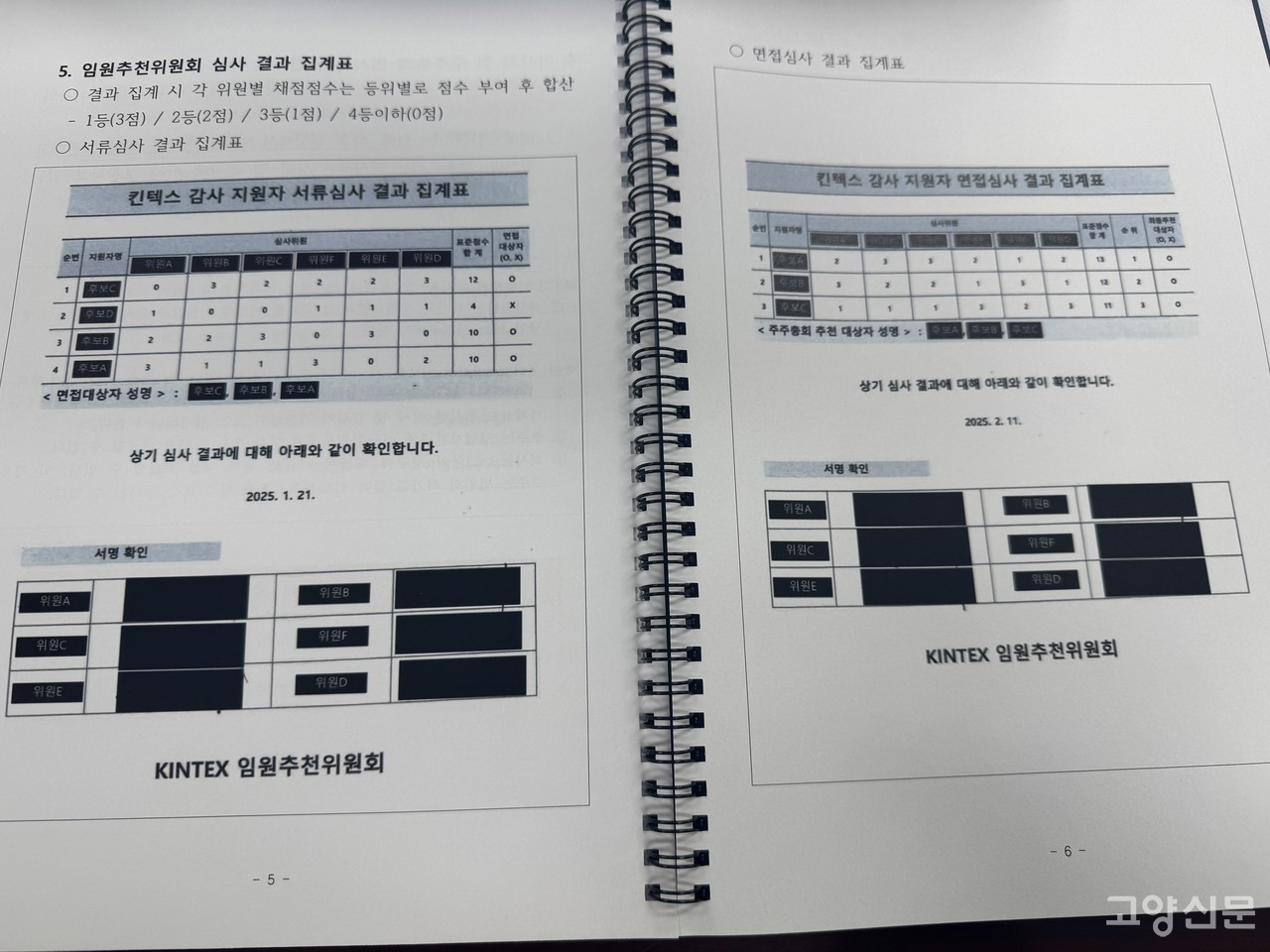 자료 비공개 문제는 이뿐만이 아니다. 특위에 따르면 킨텍스 감사직은 절차상 고양시와 경기도, 코트라가 2명씩 추천해 구성하는 임원추천위원회에서 2~3명으로 후보를 압축한 뒤 주주총회를 통해 최종 선출한다. 그러나 최 위원장은 "각 후보들이 공정하게 경쟁했는지, 서류와 면접 평가가 정당했는지를 검증할 수 있는 점수표조차 이름이 모두 검은색으로 마스킹 된 채 제출됐다"며 "개인정보보호법 등을 이유로 공개를 거부하는 것은 시민을 기만하는 행위"라고 지적했다.