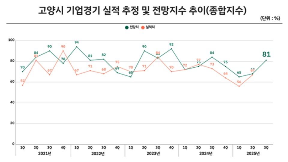 [고양신문] 고양상공회의소(회장 이상헌)는 최근 고양시 내 제조업 및 도소매업체를 대상으로 시행한 ‘2025년 3분기 기업경기전망조사(BSI; Business Survey Index)’ 결과, 전망지수가 81포인트로 집계됐다고 밝혔다. 이는 지난 2분기(67P) 대비 14포인트 상승한 수치로, 장기화한 경기 침체 속에서도 일부 업종을 중심으로 기업 심리가 다소 회복되고 있음을 시사한다.