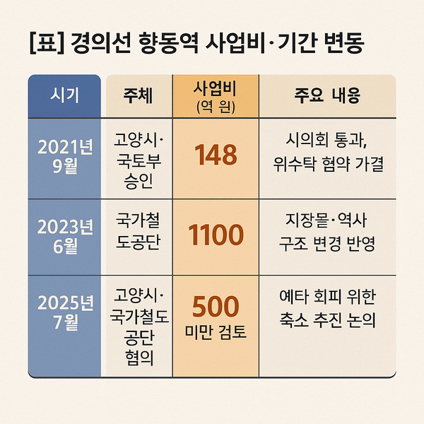 고양시 교통정책과 철도계획팀장은 “경의중앙선 향동역은 2023년 기본설계를 마쳤지만, 국가철도공단이 올해 6월 산출한 사업비는 1100억원”이라며 “향동 일대 지장물과 역사 구조 변경 등 특수 요인으로 비용이 늘었다”고 설명했다.