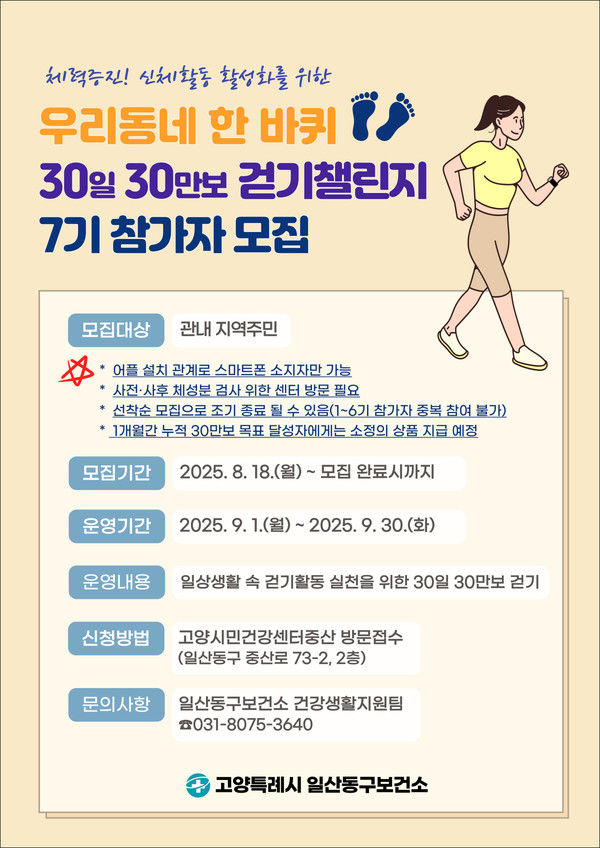 [고양신문] 일산동구보건소는 지역주민의 체력증진과 신체활동 활성화를 위해 ‘우리동네 한 바퀴 30일 30만보 걷기챌린지’7기 참가자를 오는 18일부터 모집한다.