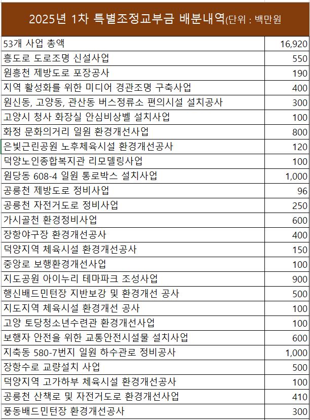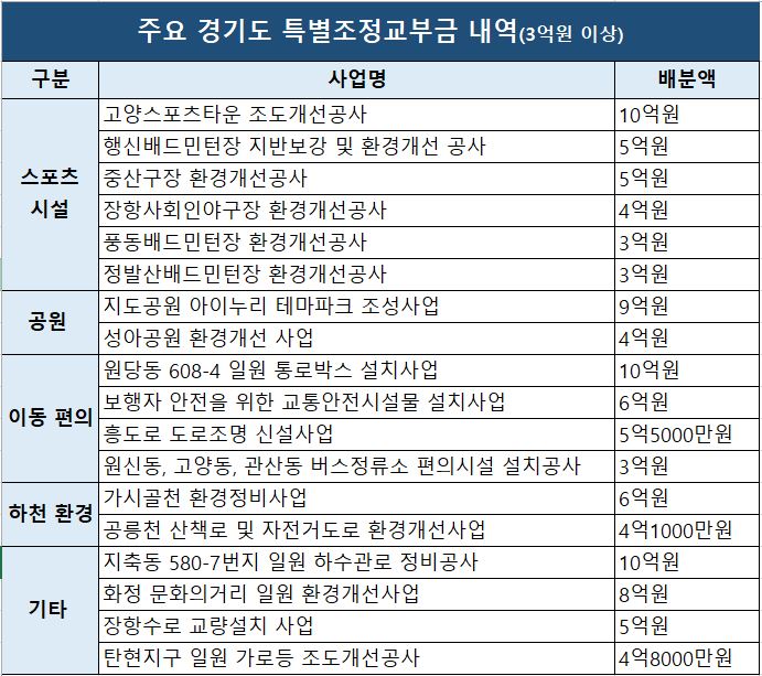 또한 주민 이동편의와 관련된 주요 특조금으로는 △원당동 608-4 일원 통로박스 설치사업 10억원 △원신동, 고양동, 관산동 버스정류소 편의시설 설치사업 5억원 △보행자 안전을 위한 교통안전시설물 설치사업 6억원 △흥도로 도로조명 신설사업 5억5000만원 △대화·가좌·덕이지구 버스정류소 편의시설 설치공사 2억원 △대곡역 접근을 위한 보행환경 개선 1억5000만원 등이다.