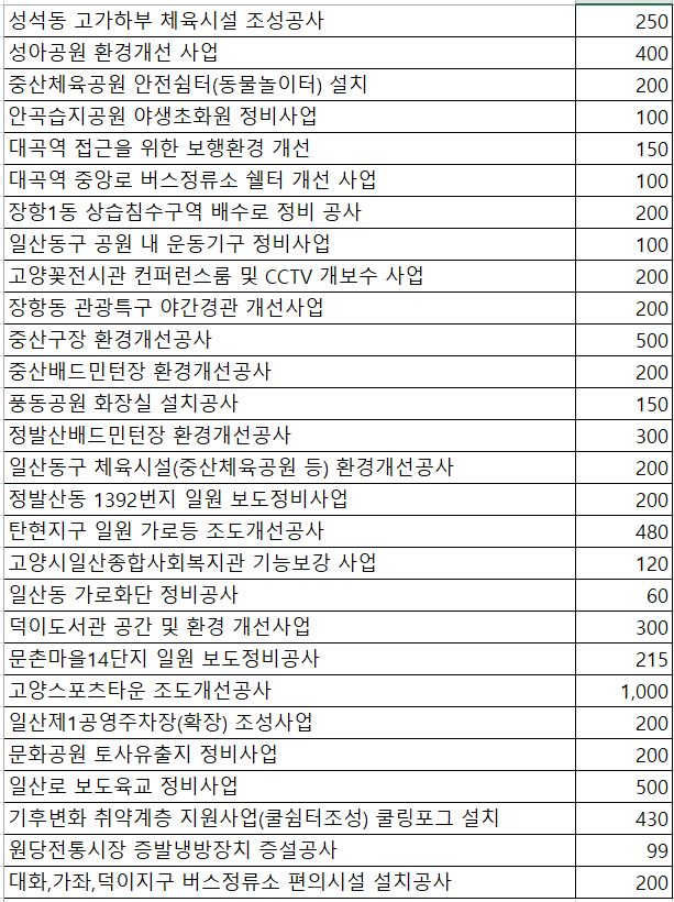 이 외에도 △지축동 580-7번지 일원 하수관로 정비공사 10억원 △화정 문화의거리 일원 환경개선사업 8억원 △장항수로 교량설치 사업 5억원 △탄현지구 일원 가로등 조도개선공사 4억8000만원 △원당전통시장 증발냉방장치 증설공사 9900만원 등의 특조금이 확보됐다.