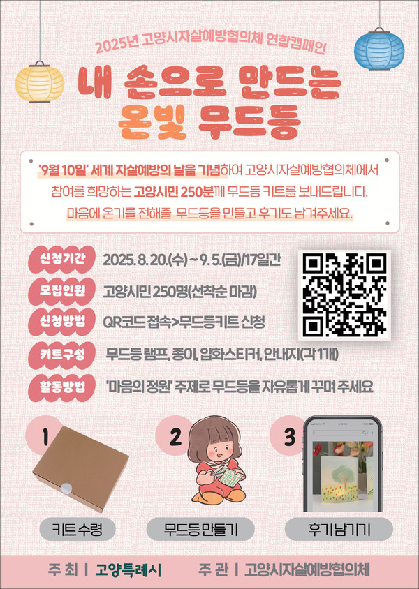 ‘내 손으로 만드는 온빛 무드등’은 ‘마음의 정원’을 주제로 무드등을 자유롭게 꾸미고 온라인 후기를 남기며 생명존중의 메시지를 나누는 시민 참여형 프로그램이다. 생명사랑에 관심 있는 고양시민이라면 누구나 참여할 수 있으며, 신청은 8월 20일부터 9월 5일까지 고양시자살예방센터 누리집 배너 또는 큐알(QR)코드로 접속이 가능하다.