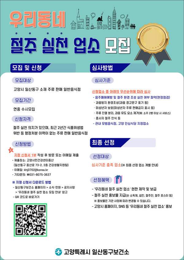 선정된 업소에는 ‘우리동네 절주 실천 업소’ 인증 현판과 절주 홍보물이 제공되며, 고양시 홈페이지와 사회관계망서비스(SNS) 등에도 적극적으로 홍보할 예정이다.