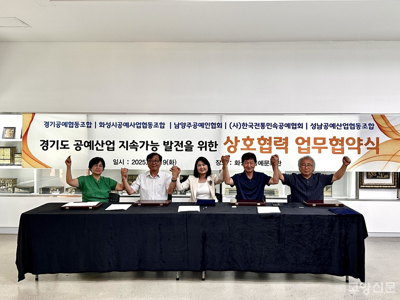 [고양신문] 지난해 6월 고양시 일산호수공원에서 현판식을 내걸고 업무를 개시한 경기공예협동조합이 지난 19일 도내 다른 4개 공예 관련 단체와 상호 협력을 위한 업무협약(MOU)을 체결했다.