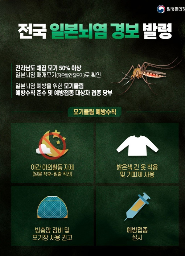 일산서구보건소 관계자는 “여름철 야외활동 시 모기에 노출될 가능성이 높아지니 예방수칙을 준수하고, 예방접종 대상자는 일정에 맞춰 반드시 접종할 것”을 당부했다.
