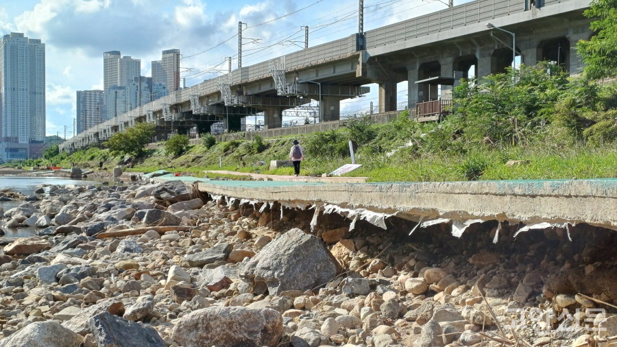 하지만 폭우로 지축지구 쪽 둔치가 절개면을 드러내며 무너져내렸고, 자전거도로는 하부가 침식돼 상판이 공중에 붕 떠버렸다. 포장이 떨어져 나간 곳에는 기초를 다져 넣은 콘크리트와 자갈더미가 고스란히 드러났고, 자전거도로 안전표지판도 뿌리가 뽑혀 천변에 나뒹굴고 있었다. 훼손된 구간은 육안으로 보기에도 수백m에 달했다. 현장에서 만난 주민은 “여름마다 부분적으로 무너지고 복구하기를 반복하긴 했지만, 올해는 예년보다 훨씬 심하다”면서 “당분간 이쪽으로 산책을 나오지 말아야겠다”고 우려를 표했다.