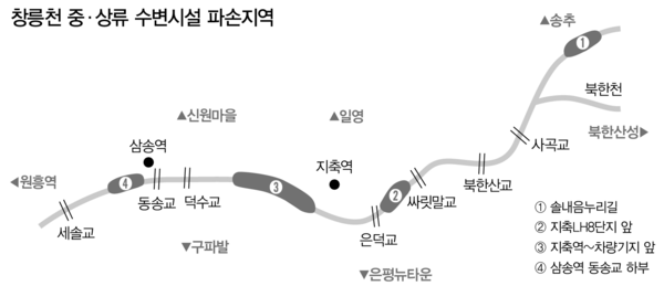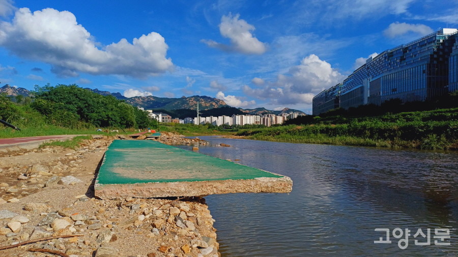 [고양신문] 지난 13일과 14일, 이틀간 고양시에 300㎜에 가까운 빗물을 쏟아부은 폭우는 주요 하천의 친수 시설에 커다란 피해를 남겼다. 특히 지축, 삼송지구가 이어진 창릉천 중상류 피해가 컸다. 피해는 시간당 100㎜에 육박하는 집중호우가 내린 13일 오후부터 시작됐다. 창릉천 발원지 사기막골 계곡에서 시작된 물살은 북한천, 삼천사계곡, 중고개천 등과 만나며 거대한 격랑으로 몸집을 불렸고, 지축지구와 삼송지구를 지나며 수변공원의 산책로, 자전거도로, 보안등 등을 거침없이 휩쓸어버렸다.