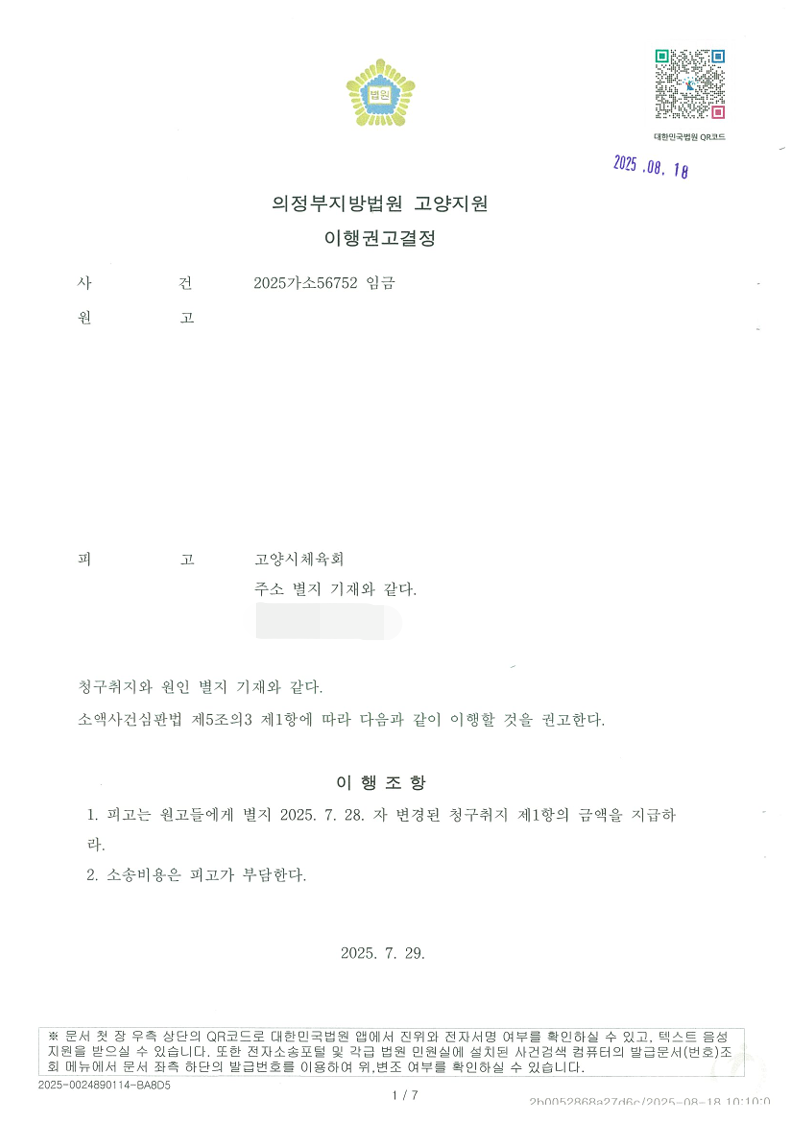 고양시체육회 직원들이 2년 가까이 이어진 임금체불 문제 해결을 촉구하며 거리로 나섰다. 이들은 지난 21일 고양시청 앞에서 열린 기자회견에 참여해 법원을 통해 인정된 체불임금의 즉각적인 지급과 고양시의 책임 있는 자세를 촉구했다. 시 보조금 삭감으로 시작된 이번 사태는 직원들의 생계 문제를 넘어 100만 특례시의 체육 행정 시스템 위기로 치닫고 있는 상태다.