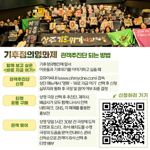 우리의 삶을 다루는 영화인만큼, 기획부터 배급까지 모든 과정을 시민이 주도한다. 이 영화의 최초 제작비는 시민들의 모금으로 충당했다. 개봉 역시 ‘100개의 극장’이라는 특별한 방식으로 진행된다. 정해진 상영작을 선택하는 기존 구조를 뒤집어, 관객이 배급의 주체가 되는 것이다. 이들이 직접 극장을 선택하고, 시민들을 모아, 영화를 초대한다. 그 결실로, 9월 17일 전국 100개의 극장에서 영화가 동시 상영되며 ‘제1회 기후정의영화제’가 열린다. 고양시에서는 CGV일산, CGV백석, CGV화정 세 곳에서 영화가 상영되며, 김지영(녹색소비자연대 이사), 김경환(동녘교회 목사), 이영아(고양신문 전 발행인), 차미성(백석동성당 찬미받으소서), 최향숙(동녘평화센터봄)씨가 관객추진단으로 참여한다.