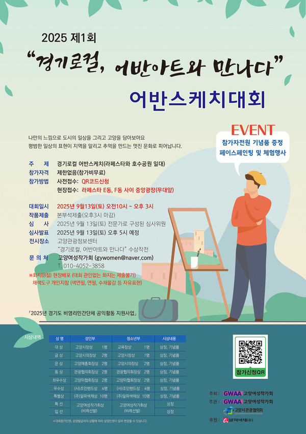 이번 대회는 고양여성작가회가 ‘2025 경기도 비영리민간단체 공익활동 지원사업’으로 진행한다. 1999년 창립한 고양여성작가회는 올해 경기도 전문예술단체로 지정받았다. 고양여성작가회 측은 “나만의 느낌으로 도시의 일상을 그리고 고양을 담는 대회”라며 시민들의 많은 관심과 참여를 당부했다.