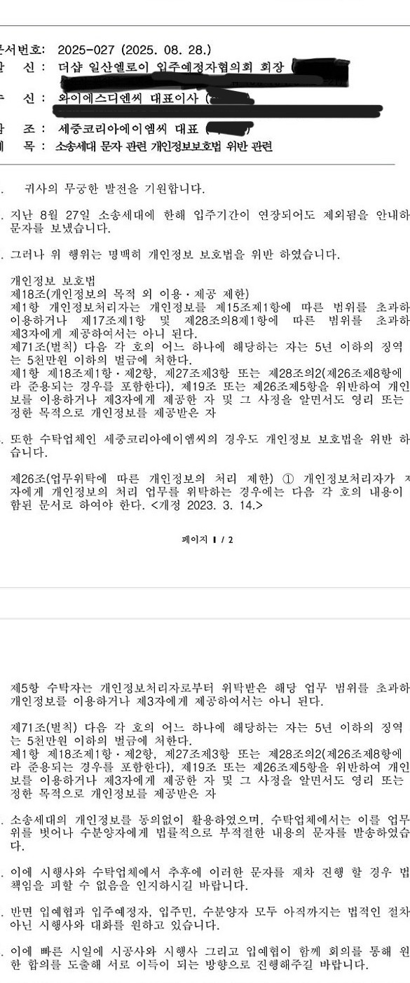 이번 문자와 관련 입예협은 시행사 측에 ‘개인정보 보호법 위반’을 명시한 반박 공문을 보냈다. 입예협은 ‘안내 문자를 보낸 관련 행위는 명백히 개인정보 보호법을 위반한 것’이라며, “금융기관을 통하지 않고는 알 수 없는 대출 관련 개인정보를 취득해 불법적인 용도로 이용했다”고 주장했다.