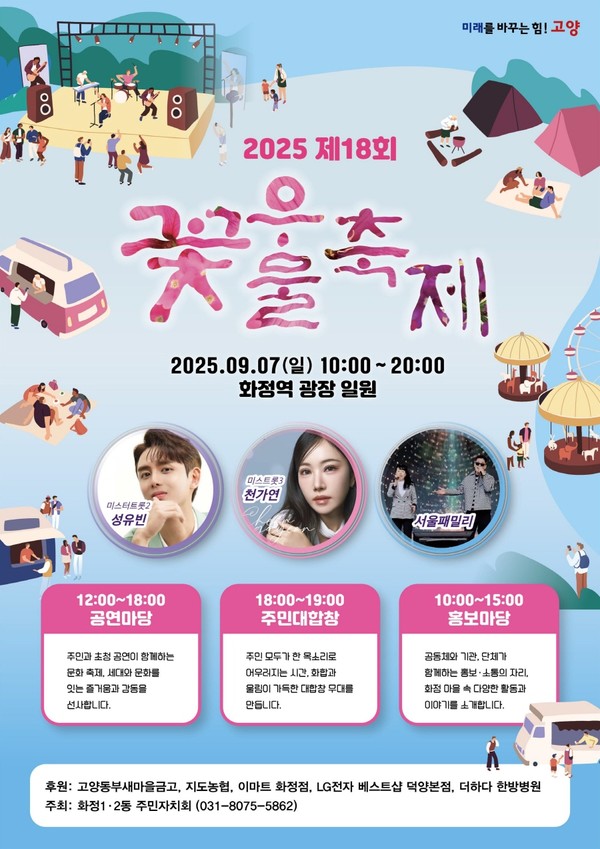 이번 축제는 광복 80주년을 기념해 화정1동 주민자치회(회장 장정효)와 화정2동 주민자치회(회장 김동조)가 공동 주최하며 ‘제18회 꽃우물축제’와 ‘2025 화정 주민문화제’가 결합한 옴니버스 축제 형식으로 진행된다.