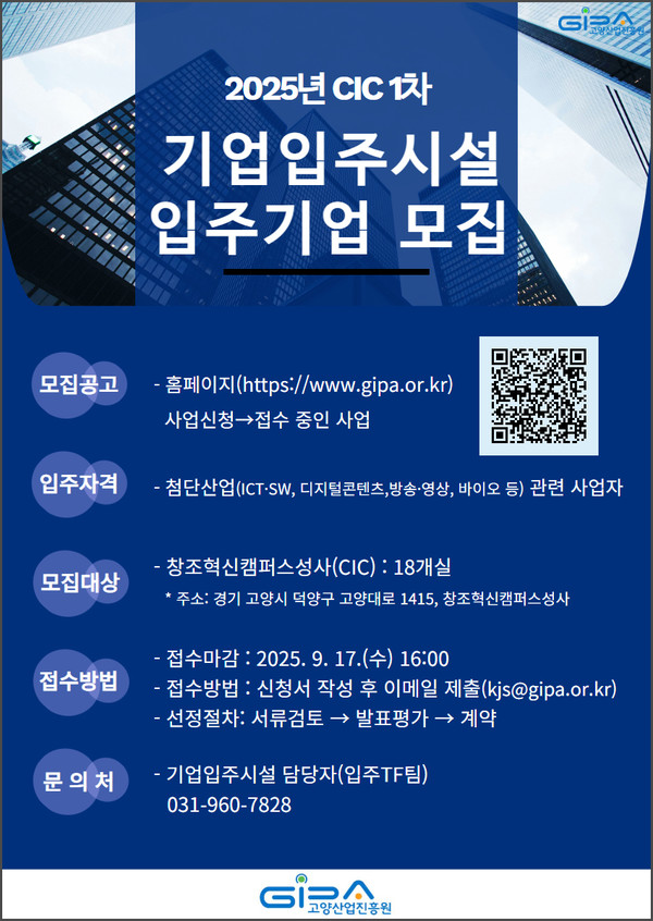 입주를 희망하는 기업은 진흥원 누리집(www.gipa.or.kr)에서 신청양식을 내려받아 작성한 후 9월 17일 오후 4시까지 이메일로 제출하면 된다. 서류심사와 발표평가를 거쳐 최종 입주기업이 선정되며, 11월 중으로 입주가 가능하다.