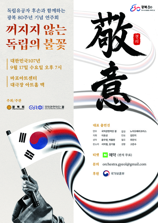[고양신문] 광복회(회장 이종찬)와 국악관현악단 ‘결’(대표 이호성)이 공동 주최하는 광복 80주년 기념연주회 <꺼지지 않는 독립의 불꽃, 경의>가 오는 9월 17일(수) 오후 7시 마포아트센터 대극장 아트홀 맥에서 개최된다.