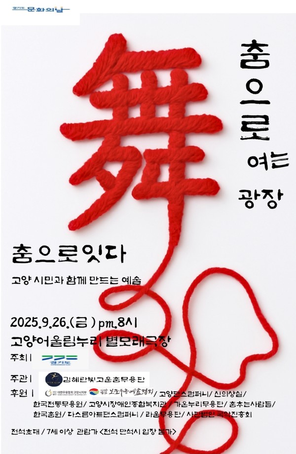 [고양신문] 가을밤, 춤으로 마음을 잇는 특별한 무대가 열린다. 오는 26일 오후 8시 고양어울림누리 별모래극장에서 ‘춤으로 여는 광장-함께 만드는 예술 <춤으로 잇다>’가 막을 올린다. 김혜란빛고운춤무용단(대표 김혜란)이 주관하고 경기도가 주최하는 ‘춤으로 잇다’는 전통과 현대, 개인과 공동체를 아우르며 시민이 예술을 직접 경험하고 함께 호흡할 수 있도록 기획됐다. 7세 이상이면 누구나 무료로 관람할 수 있다.