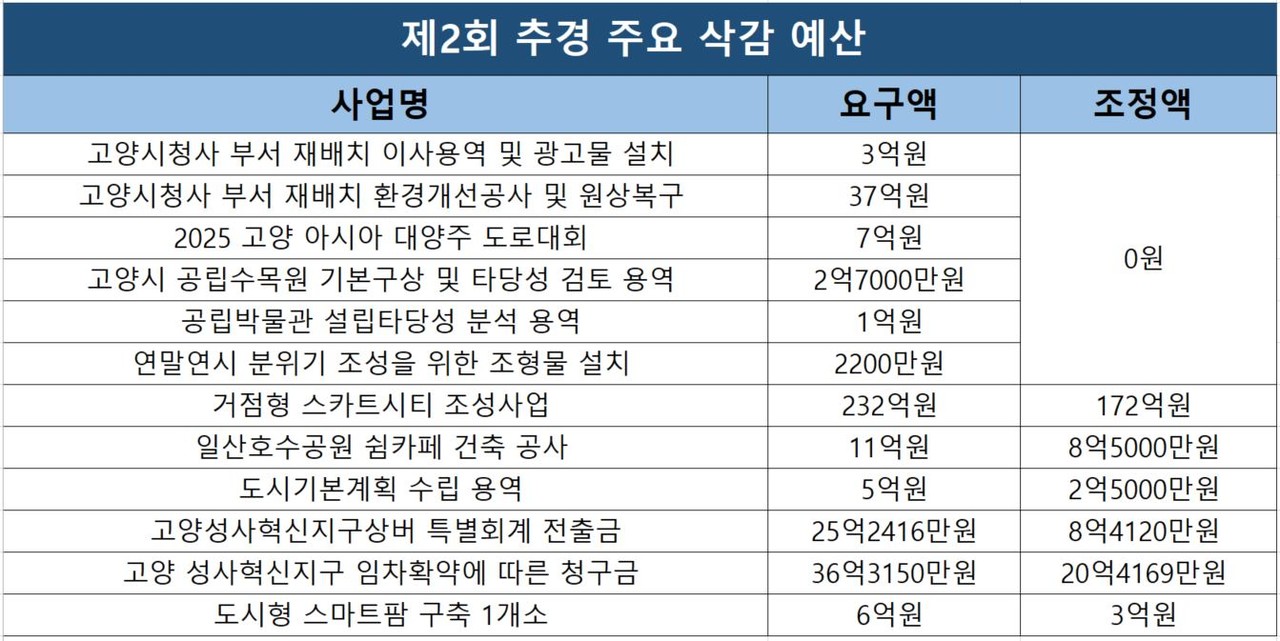 이번 2회 추경 심사에서 대표적인 단골 삭감 예산은 △시 부서 백석업무빌딩 이전 예산(40억원) △아시아·대양주 도로대회 예산(7억원) △고양시 공립수목원 기본구상 및 타당성 검토 용역 예산(2억7000만원) △공립박물관 설립 타당성 분석 용역 예산(1억원) 등이다.
