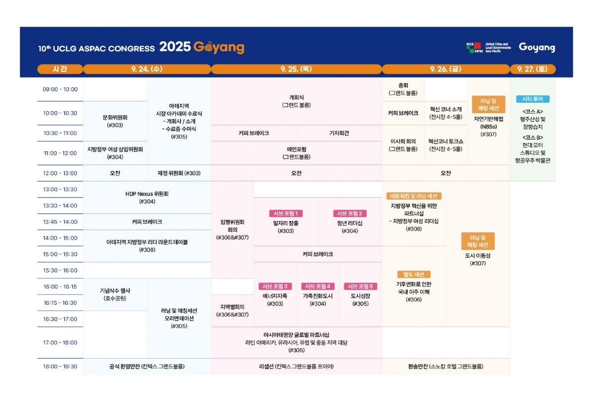 이번 총회는 심도 있는 논의뿐만 아니라 다채로운 교류와 문화 행사로 채워진다. 첫날인 24일에는 제주특별자치도, 중국 광저우시, 경기도가 주관하는 위원회 회의가 각각 열리고, 일산호수공원에서는 도시 간 연대를 다지는 기념식수 행사가 진행된다. 저녁 환영 만찬에서는 김덕수 사물놀이와 고양시 대표 스트릿 댄스크루의 K-POP 공연이 펼쳐져 한국의 멋을 알린다.
