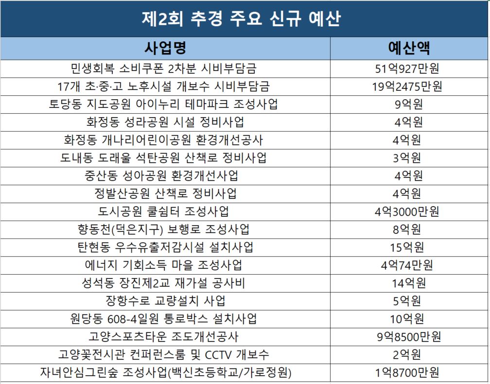 이번에 신규로 편성된 주요 예산 중 가장 눈에 띄는 것은 ‘민생회복 소비쿠폰 2차분 시비부담금’ 51억927만원이다. 소득하위 90% 국민에게 1인당 10만원씩 지급하는 민생회복 소비쿠폰 2차분 신청은 9월 22일부터 10월 31일까지다. 사용기간은 1차분과 동일한 올해 11월 30일까지다. 민생회복 소비쿠폰 2차분은 일반국민 15만원, 차상위·한부모 30만원, 기초수급자 40만원을 지급했던 1차분에 대한 시비부담금 83억9072억원에 비해 약 33억원 줄어든 셈이다. 민생회복 소비쿠폰은 국비 90%, 도비 5%, 시비 5%로 충당한다. 고양시 관계자는 “민생회복 소비쿠폰 발급 비용의 시비 부담분은 135억원으로, 시는 대응할 재원이 부족한 상황임을 고려해 통합재정안정화기금에서 융자를 통해 우선 충당할 예정”이라고 밝혔다.