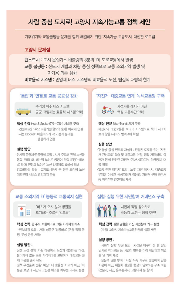 [고양신문] 지난 7회에 걸쳐 고양신문은 ‘기후위기 대응을 위한 지속가능교통’의 현주소를 진단했다. 취재 결과, 도시 온실가스 배출량의 3분의 1을 도로교통이 차지하는 ‘탄소도시’ 고양의 현실은 암담했다. 3기 신도시와 각종 개발사업은 더 많은 도로와 자동차를 불러들이고 있으며, 시민들은 교통 소외와 불평등을 온몸으로 겪고 있었다. 땜질식 처방만으로는 이 거대한 위기를 넘어설 수 없다. 이제 고양시는 승용차 중심의 낡은 패러다임을 폐기하고, 사람과 공공성을 중심으로 하는 지속가능 교통도시로의 대전환이 필요하다. 본지는 그간의 취재 내용을 종합해 다음과 같은 정책을 제안한다.