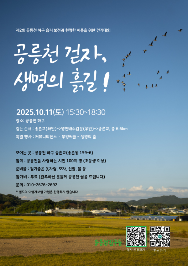 11일 오후 3시30분에 시작되는 걷기행사는 공릉천이 한강과 만나는 송촌교에서 출발해 하천 좌안 둑방길을 따라 영천배수갑문까지 올라갔다가, 반대편 우안 둑방길로 되돌아오는 6.6㎞ 왕복 코스로 진행된다. 아울러 예술가 안재은의 커뮤니티 댄스무빙 ‘써클-생명의 춤’ 퍼포먼스, 구간별 미션 이벤트 등이 펼쳐지고, 걷기를 완주한 참가자에게는 공릉천 들녘에서 생산한 쌀도 증정한다. 문의 010-2676-2692. 신청링크 https://form.naver.com/response/HBSQzxM6pMRuqsoTJzhzGg