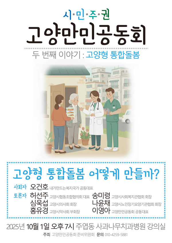 [고양신문] 내년 3월 시행 예정인 ‘통합돌봄 관련 법률’을 앞두고, 고양시 지역사회가 자발적으로 노인복지 해법을 모색하는 자리가 마련된다. 10월 1일 오후 7시 주엽동 사과나무치과병원 강의실에서 ‘2차 만민공동회’가 열린다. ‘고양형 통합돌봄, 어떻게 만들까?’라는 제목으로 열리는 이번 행사는 시민과 돌봄 관련 전문가들이 모여 통합돌봄의 현황과 과제를 함께 논의하는 자리다.