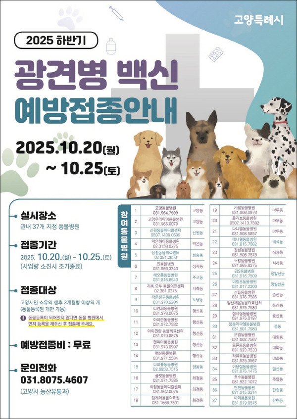 고양시 관계자는 “반려견과의 야외 활동이 활발해지는 가을은 광견병 예방에 관심이 필요한 때이다. 반려동물과 시민의 건강을 위해 광견병 예방접종에 많은 참여를 부탁드린다”라고 말했다.