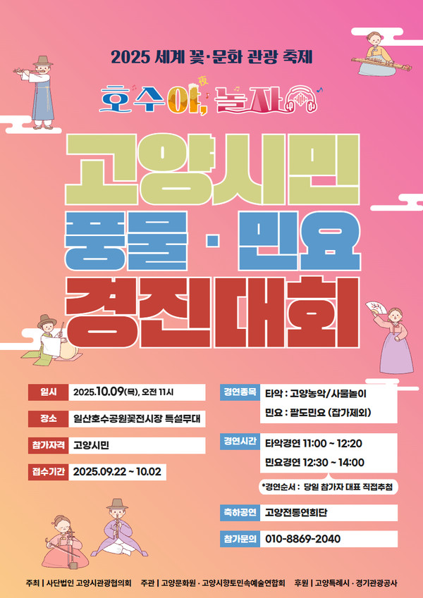 [고양신문] 2025 세계 꽃 문화 관광 축제의 일환으로 마련된 ‘호수야, 놀자’ 고양시민 풍물·민요 경진대회가 오는 10월 9일 오전 11시, 일산호수공원 꽃전시장 특설무대에서 펼쳐진다.