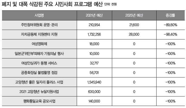 여성과 노동 등 사회적 약자를 위한 안전망도 허물어졌다. 여성영화제, 일본군 ‘위안부’피해자 기림의날 행사, 여성안심귀가 동행 서비스, 공중화장실 불법촬영 점검 예산은 전액 삭감됐다. 경제 활성화를 외치면서도 정작 사회복지 분야 내 ‘노동’ 항목 예산은 2021년 99억7000만원에서 2025년 51억2000만원으로 반토막 났다.