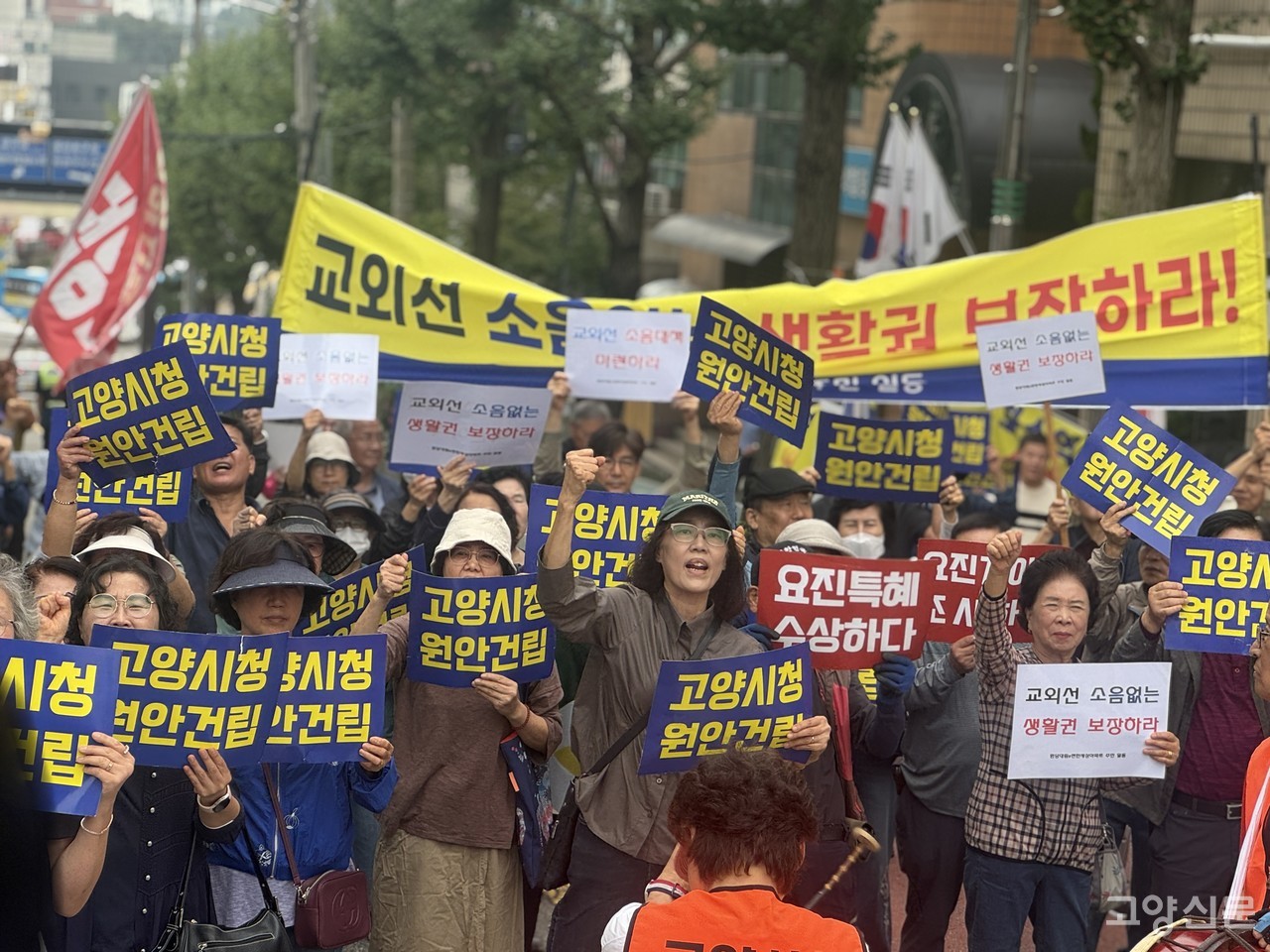 30일 오전 고양시청 앞에서 이동환 시장의 일방적인 시정 운영에 분노하는 규탄집회가 열렸다. ‘고양시청 원안건립 추진연합회’를 비롯해 식사동 데이터센터 반대 주민, 교외선 소음진동 대책위 등 각기 다른 현안으로 고통받던 주민들이 한자리에 모여 ‘시청 쪼개기 즉각 철회’, ‘시청 원안사업 즉시 착공’, ‘식사동 데이터센터 백지화’, ‘교외선 소음·진동 대책 마련’ 등을 한목소리로 촉구했다.