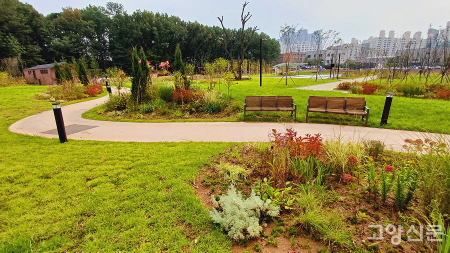 남쪽 구역의 초입에는 아이들이 신나게 뛰어놀 수 있는 모험놀이터가 자리하고, 그 옆에는 쾌적한 벽천쉼터와 반원형 이벤트광장이 조성됐다. 다양한 연령대가 함께 휴식과 행사를 즐기기에 좋을 듯하다. 뒤편으로는 솔향기숲, 단풍정원, 잔디마당, 그라스 정원 등 계절에 따라 색색의 풍경을 연출할 다채로운 순환 산책로가 꾸며졌다.