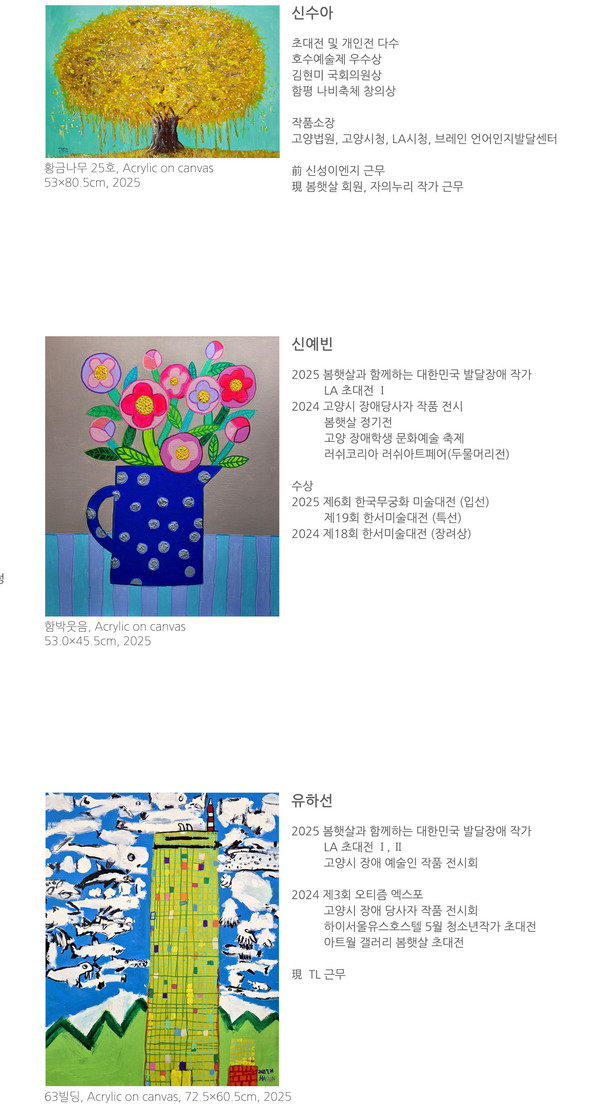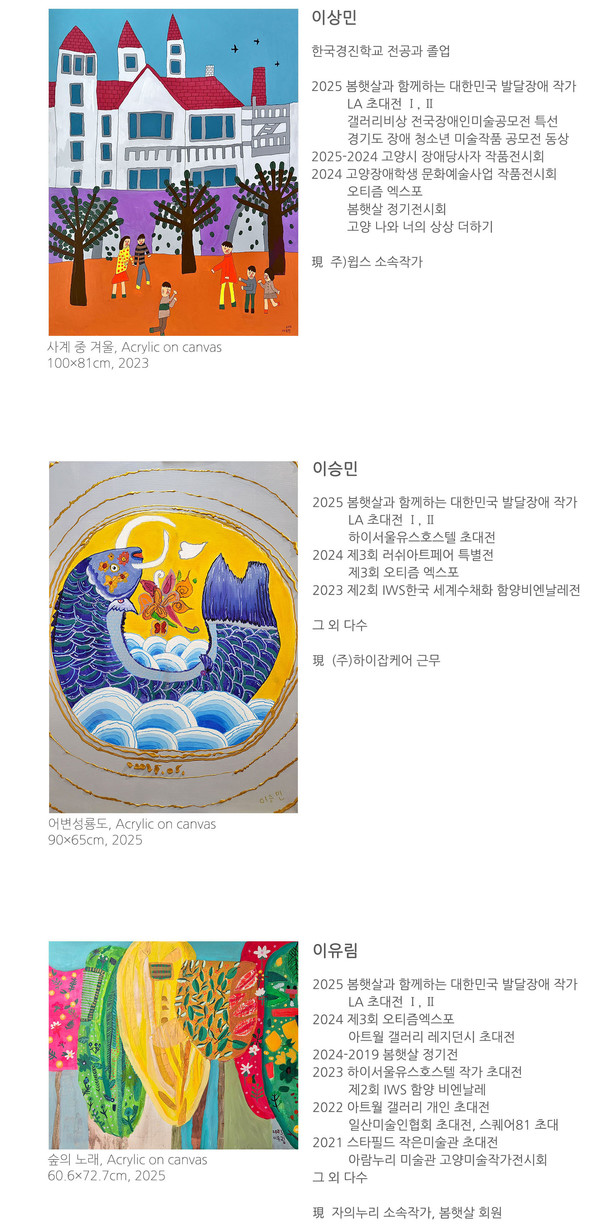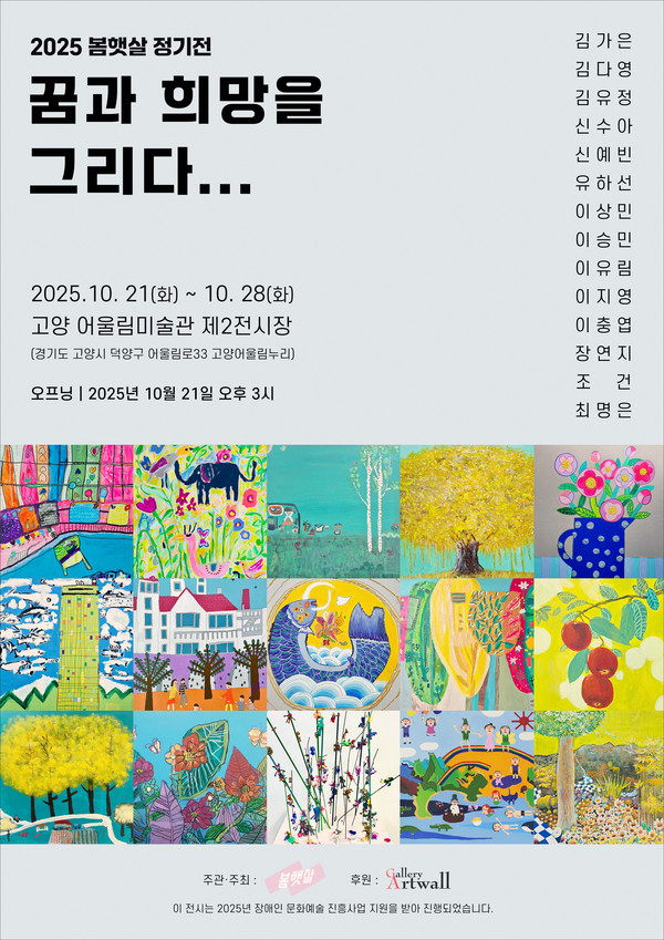 [고양신문] 고양시 발달장애 청년작가 단체 ‘봄햇살’이 오는 10월 21일부터 28일까지 고양어울림누리 어울림미술관 제2전시장에서 정기전 <2025 봄햇살 정기전 – 꿈과 희망을 그리다...>를 연다. 이번 전시는 오전 10시부터 오후 6시까지 관람할 수 있으며, 월요일(10월 27일)은 휴관이다.