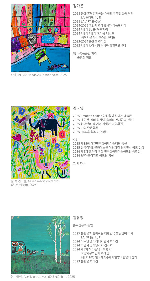 ‘봄햇살’은 2018년 결성 이후 꾸준히 창작 활동과 전시를 이어온 발달장애 청년작가 모임이다. 이번 정기전에는 김가은, 김다영, 김유정, 신수아, 신예빈, 유하선, 이상민, 이승민, 이유림, 이지영, 이충엽, 장연지, 조건, 최명은 등 총 14명의 회원 작가가 참여해 총 33점의 작품을 선보인다.