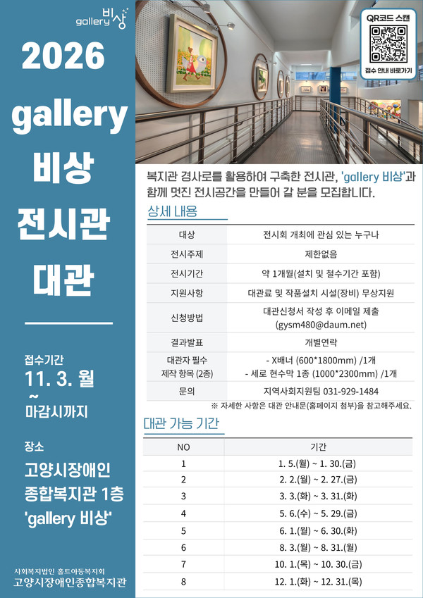 [고양신문] 고양시장애인종합복지관(운영법인 사회복지법인 홀트아동복지회)은 장애예술인의 창작 활동을 지원하고 지역사회 누구나 예술을 향유할 수 있는 열린 전시 환경 조성을 위해 2026년 갤러리 비상 전시관 대관자를 공개 모집한다.