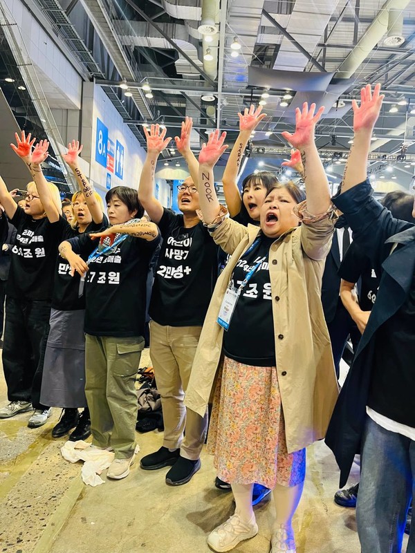 지난 21일 낮 12시경, 무기박람회저항행동과 국제앰네스티 한국지부 소속 활동가들이 ADEX 2025 전시장 내 이스라엘 방산기업 부스 앞에서 규탄 시위를 벌였다. 활동가들은 손과 옷에 구호를 새기고, 학살 피해자의 이름을 적는 방식의 퍼포먼스를 병행하며 집단학살과 무기거래에 대한 반대 입장을 표명했다.