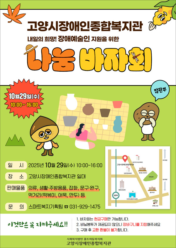 [고양신문] 고양시장애인종합복지관(관장 황성진)은 오는 29일 복지관 일대에서 ‘내일의 희망! 장애예술인 지원을 위한 나눔 바자회’를 개최한다.