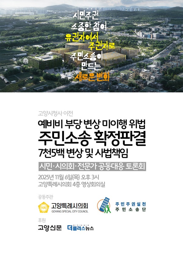 [고양신문] 고양시 시청사 이전과 관련된 예비비 위법 집행에 대한 주민소송 판결이 지난 10월 1일 확정된 가운데, 이에 대한 첫 공식 토론회가 열린다. 고양시의회와 주민주권실천주민소송단은 오는 11월 6일 오후 3시 고양시의회 4층 영상회의실에서 ‘예비비 부당·변상미이행 위법 주민소송 확정판결 대응 공동토론회’를 개최한다.