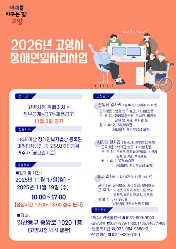 선발된 참여자는 2026년 1월 1일부터 12월 31일까지 동 행정복지센터, 공공기관, 사회복지 시설과 단체 등 장애인의 능력과 특성에 맞춘 업무 보조를 담당하게 된다. 기타 자세한 사항은 시 누리집(홈페이지) 채용공고 게시판에서 확인할 수 있다. (문의 031-909-9000)