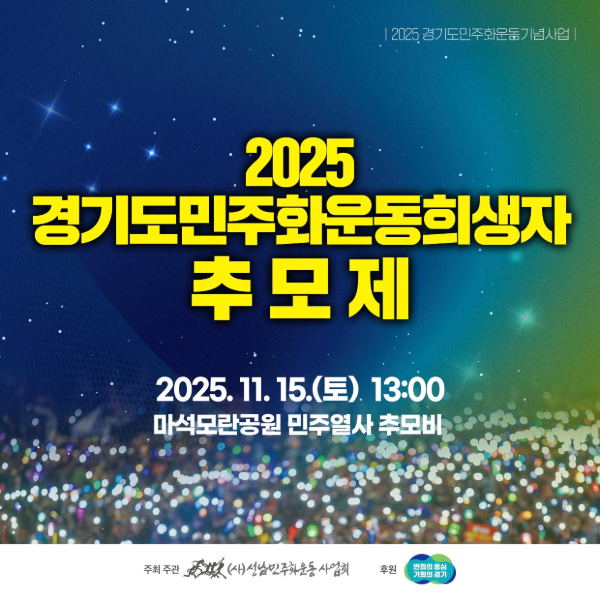 [고양신문] 사단법인 성남민주화운동사업회(이사장 이상락)는 ‘순국선열의 날(11.17)’을 맞아 오는 15일 오후 1시에 경기 남양주시 마석 모란공원 민주열사 묘역에서 ‘2025경기도 민주화운동희생자 추모제’를 개최한다.