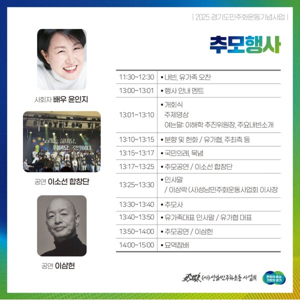 행사는 ▲이해학 경기도민주화운동기념사업 추진위원장의 기념사 ▲이상락 이사장의 인사말 ▲추모공연 ▲민주열사 유가족 대표 인사 ▲분향·헌화 및 참배 순으로 진행된다.
