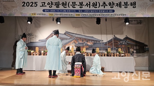 [고양신문] 고양문봉서원 팔현 추향제가 지난 11일 고양문화원 대강당에서 봉행됐다. 초헌관은 김달수 경기도의회 전 의원, 아헌관은 박효순 용강서원장, 종헌관은 기봉함 행주기씨 복재공파회장이 맡았고, 감재는 안재성 고양시향토문화진흥원장이, 대축은 이현규 행주서원 유사가 맡아 봉행했다.
