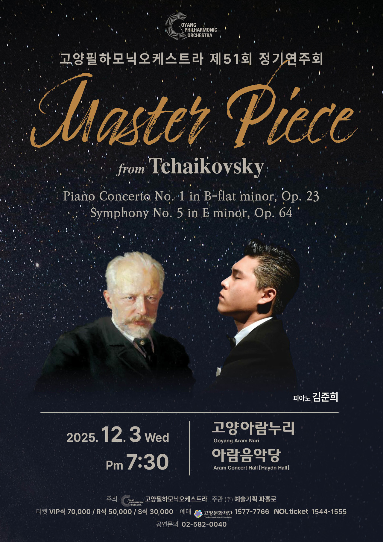 [고양신문] 고양필하모닉오케스트라(지휘 안현성)는 12월 3일 오후 7시30분 고양아람누리 아람음악당에서 제51회 정기연주회 ‘Master Piece from Tchaikovsky’를 선보인다. 이번 무대는 러시아 음악의 거장 표트르 일리치 차이코프스키의 대표작 두 곡으로 구성돼 낭만과 열정, 운명적 감정이 교차하는 러시아 클래식의 진수를 선사한다.