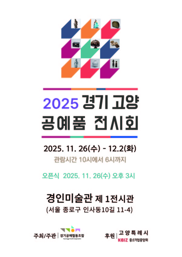 [고양신문] 경기공예협동조합(이사장 전진숙)은 11월 26일부터 12월 2일까지 서울 종로구 인사동 경인미술관 제1전시장에서 ‘2025 경기 고양 공예품 전시회’를 개최한다. 이번 전시는 경기지역 공예문화의 저변 확대와 지역 공예인 간 교류 활성화를 위해 마련됐다. 조합 관계자는 “공예산업의 가치 제고와 판로 확대를 위한 중요한 계기가 될 것”이라고 전했다.