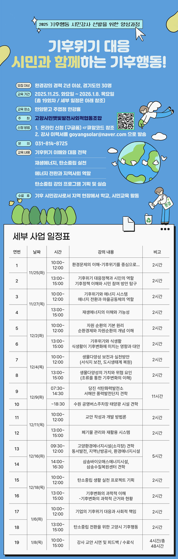 [고양신문] 기후위기에 대응하기 위한 시민교육이 고양시에서 본격화된다. 고양시민햇빛발전사회적협동조합(이사장 박평수)은 기후위기 대응 역량을 갖춘 시민강사를 양성하기 위해 11월 25일부터 내년 1월까지 ‘기후행동 시민강사 양성과정’을 운영한다. 이 과정은 지역사회의 기후 감수성을 높이고 에너지 전환 실천을 이끌 수 있는 강사 인력을 양성하는 것을 목표로 한다.